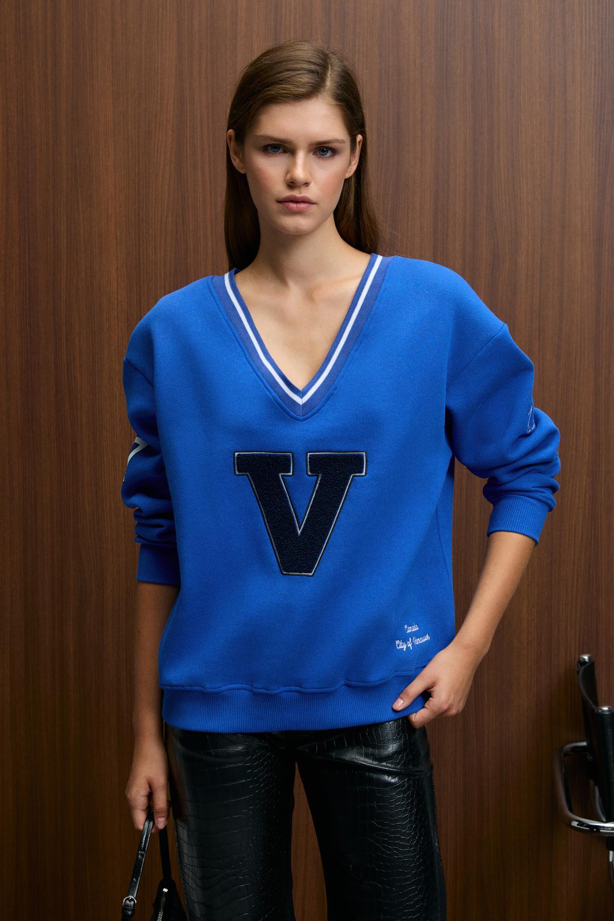 DIVINE Kadın V Yakalı Nakış Ve Patch Detaylı Mavi Sweatshirt