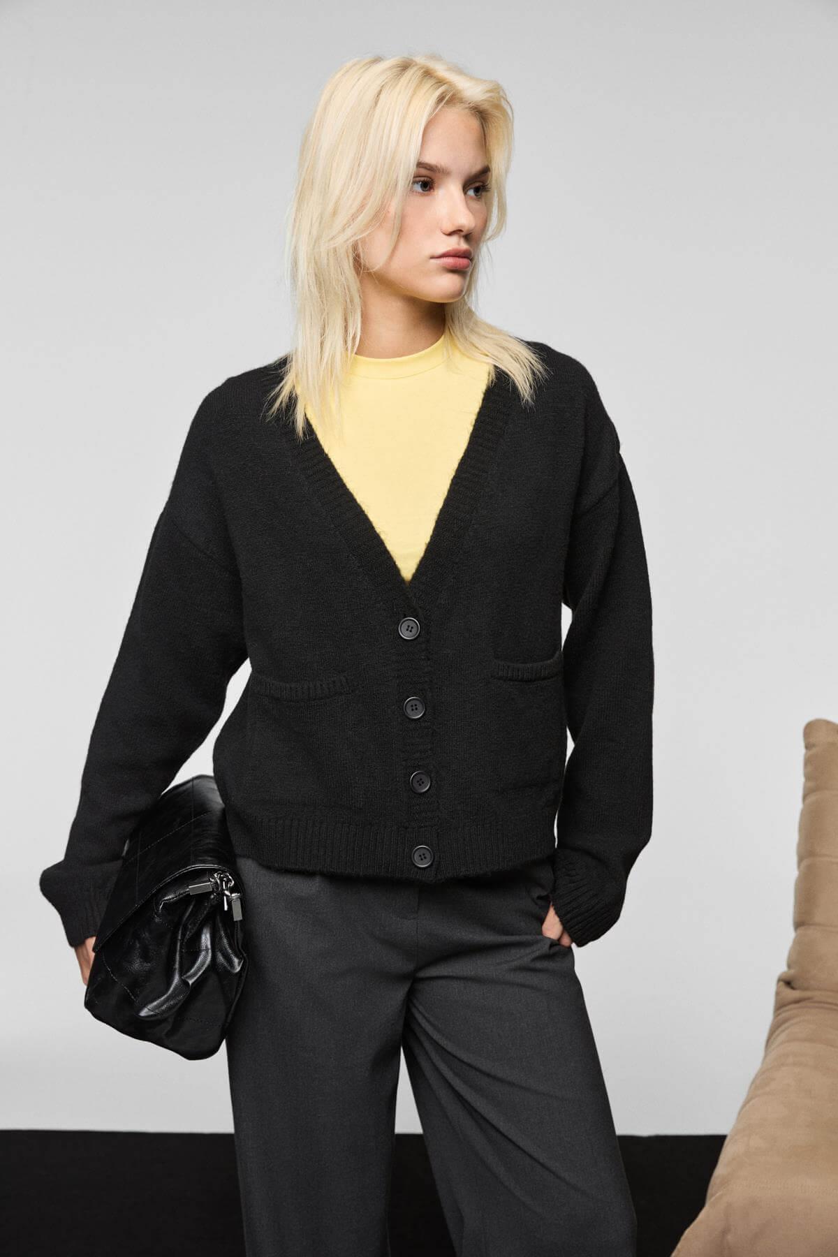ESENCIA Kadın V Yaka Uzun Kollu Düğmeli Cepli Yumuşak Dokulu Regular Triko Siyah Kazak