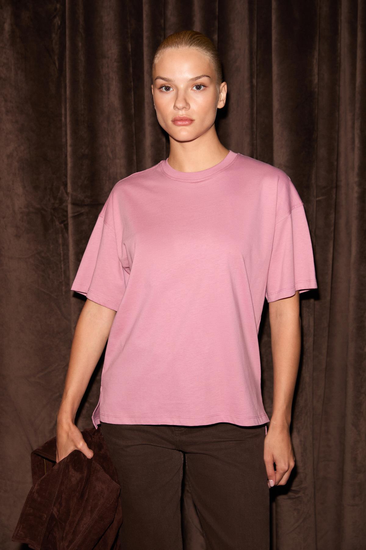Jemmy Kadın %100 Organik Pamuk Relaxed Fit Yırtmaçlı Yuvarlak Yakalı Gül Kurusu T-Shirt