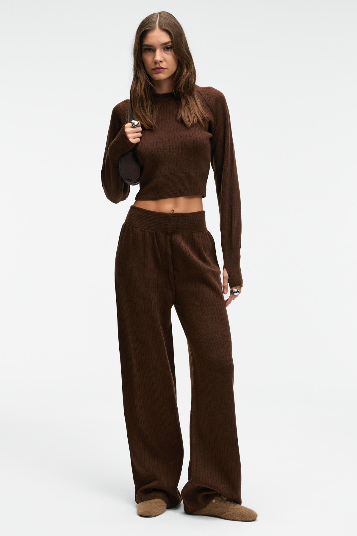 MARIPOSA Kadın Yuvarlak Yaka Çizgi Desenli Crop Geniş Paça Triko Kahverengi Alt-Üst Takım