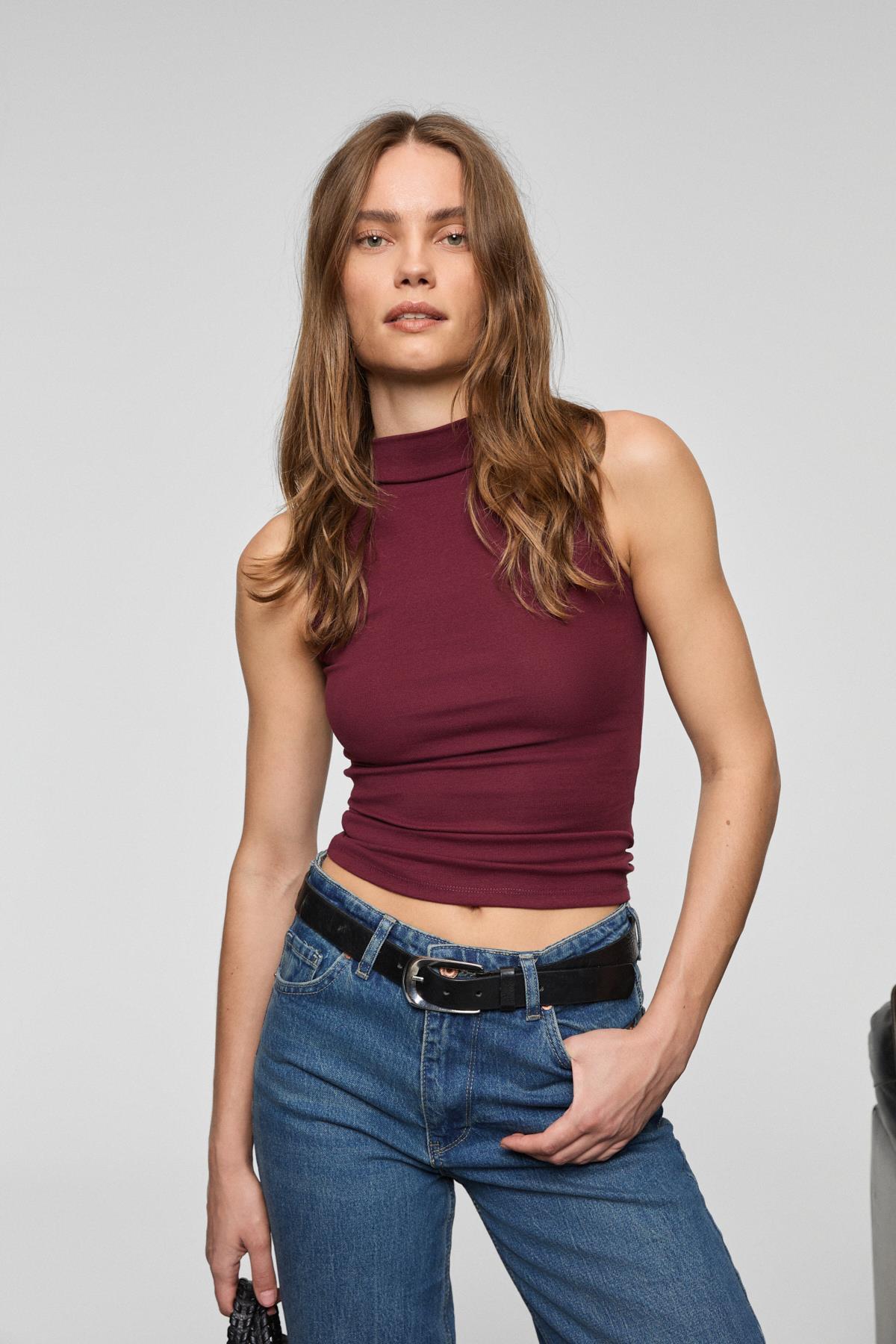 MIRUVA Kadın Halter Yaka Esnek Kumaşlı Sıfır Kollu Bordo Bluz