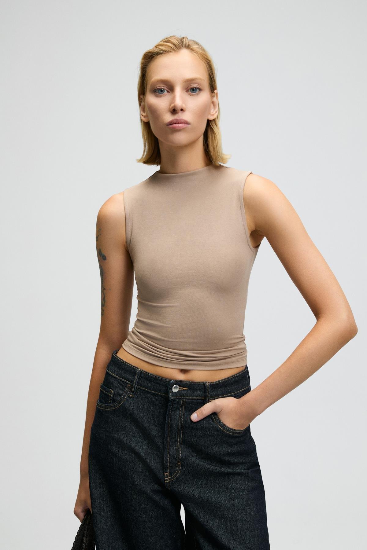MIRUVA Kadın Halter Yaka Esnek Kumaşlı Sıfır Kollu Vizon Bluz