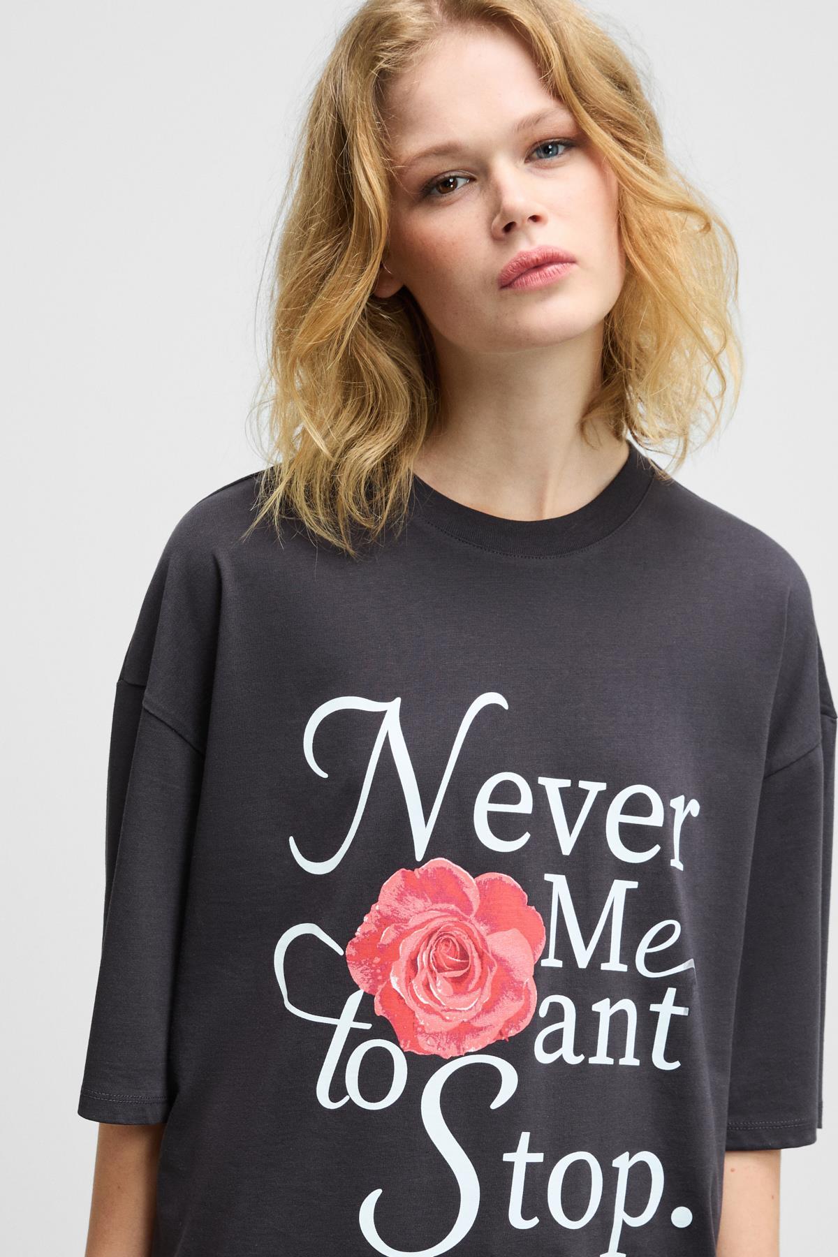 MOKILA Kadın Yumuşak Ve Esnek Kumaşlı Baskı Detaylı Bisiklet Yakalı Antrasit T-Shirt