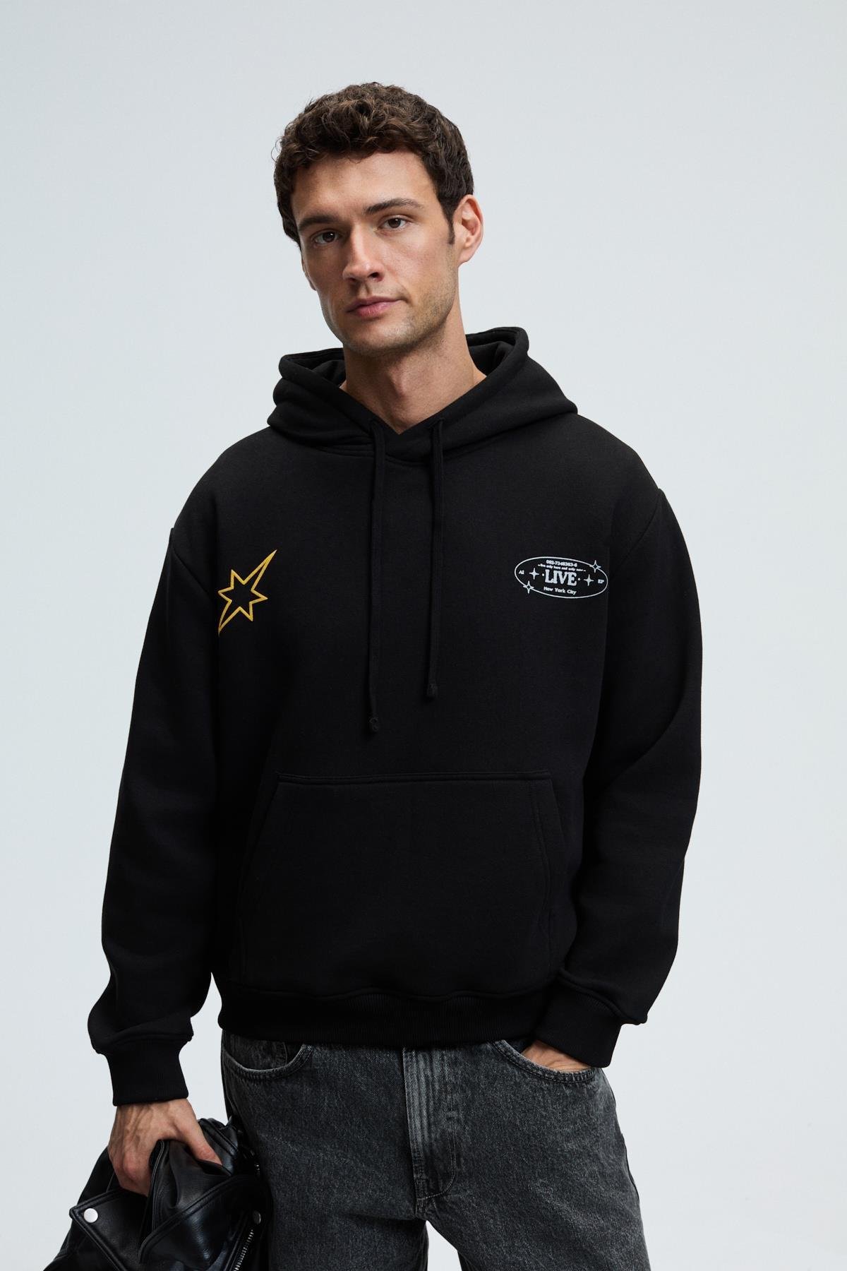 PASCAL Erkek Kapüşonlu Kanguru Cepli Önü Ve Sırtı Baskılı Regular Fit Siyah Sweatshirt