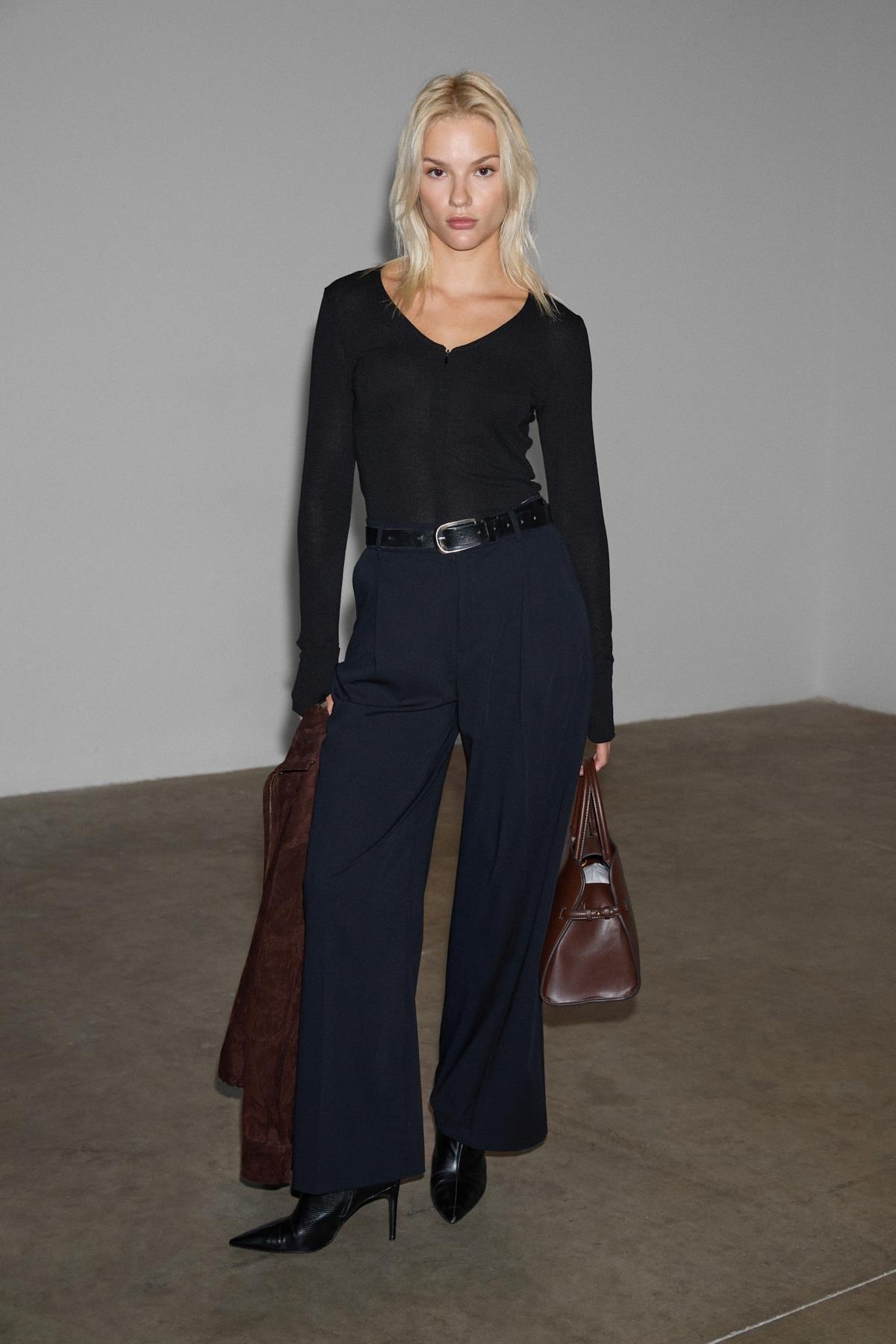 POLUNEA Kadın V Yakalı Önü Fermuar Kapamalı Vücuda Oturan Slim Fit Siyah Bluz