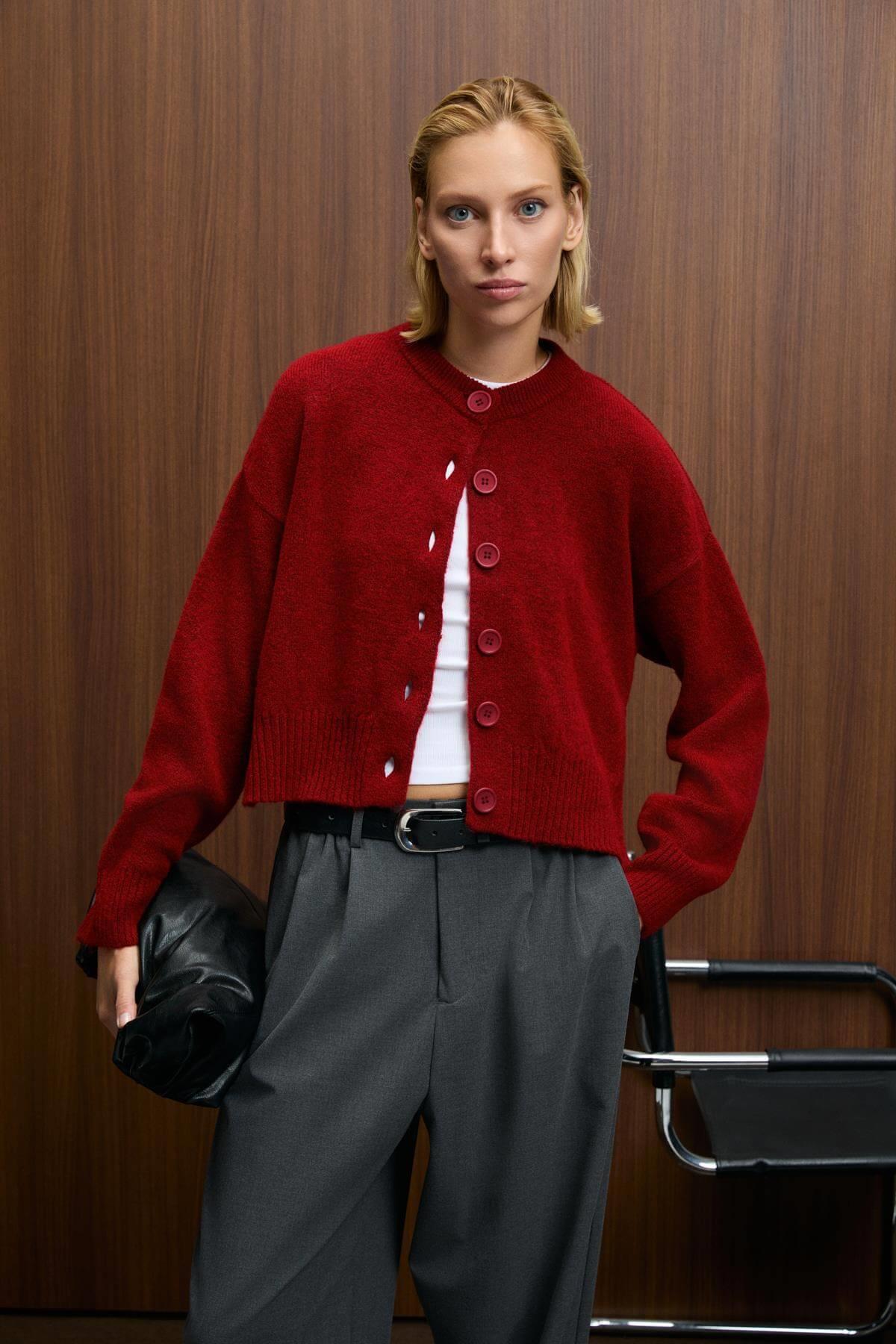 PUREZA Kadın Yuvarlak Yakalı Uzun Kollu Düğmeli Yumuşak Dokulu Regular Fit Triko Kırmızı Kazak