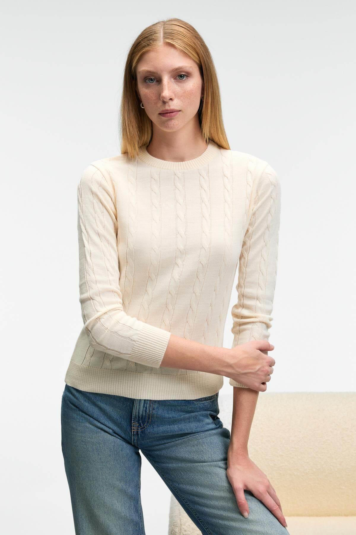 QUERIDA Kadın Yuvarlak Yaka Saç Örgülü Regular Fit Triko Ekru Kazak