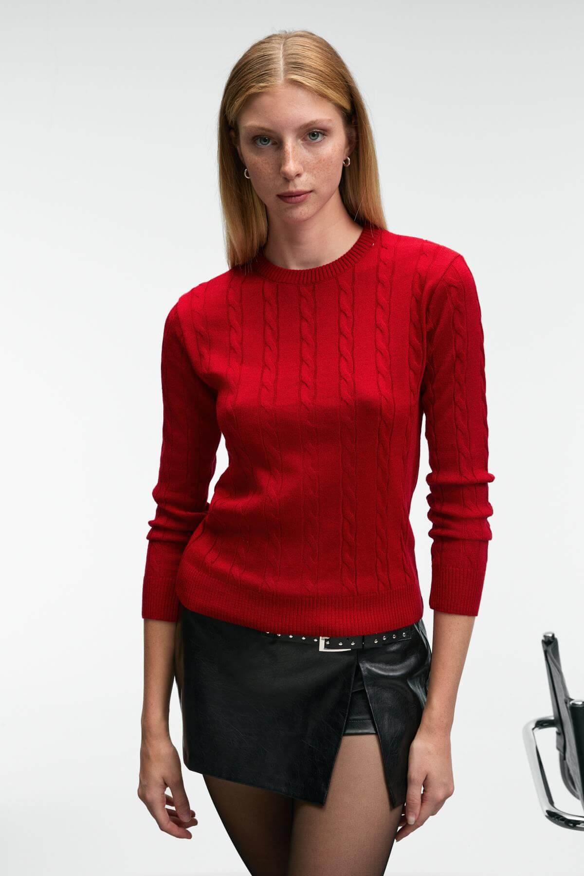 QUERIDA Kadın Yuvarlak Yaka Saç Örgülü Regular Fit Triko Kırmızı Kazak