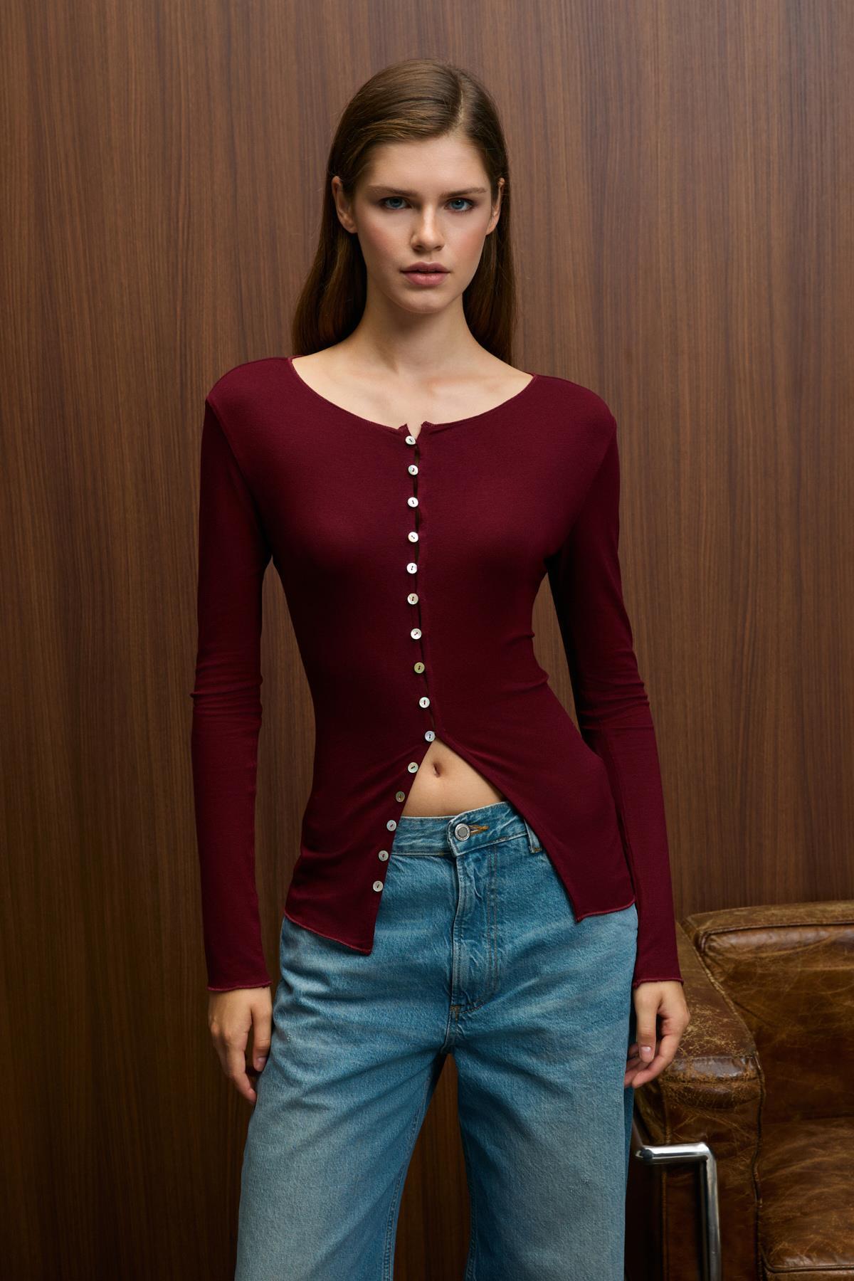 SILLARIE Kadın Uzun Kollu Esnek Kumaşlı Düğmeli Regular Bordo Bluz