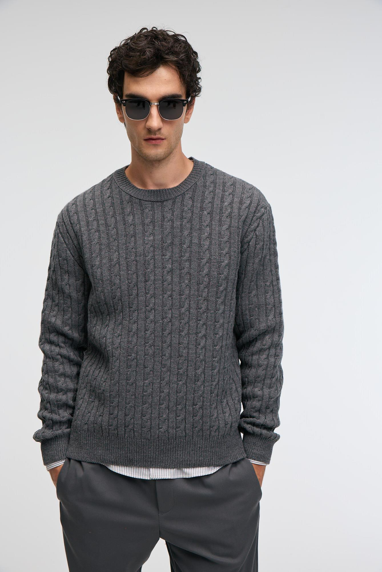 VINTLACE Erkek Yuvarlak Yaka Saç Örgü Desenli Regular Fit Triko Antrasit Kazak