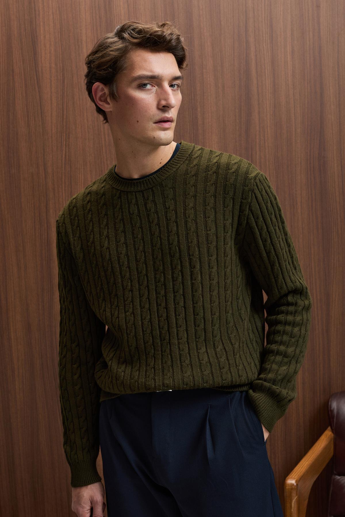 VINTLACE Erkek Yuvarlak Yaka Saç Örgü Desenli Regular Fit Triko Haki Kazak