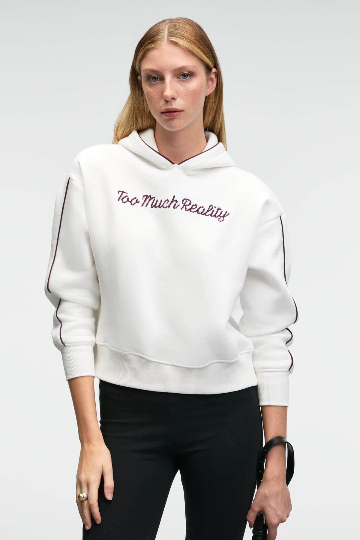 VIRETHIA Kadın Ara Biyeli Baskı Ve Nakış Detaylı Kapüşonlu Relaxed Beyaz Sweatshirt